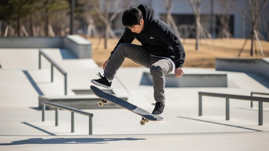 - 트릭 (Trick): ‘알리(Ollie, 점프)’, ‘플립(Flip, 보드 회전)’ 등 공중 기술을 배우는 것이 주 목적.