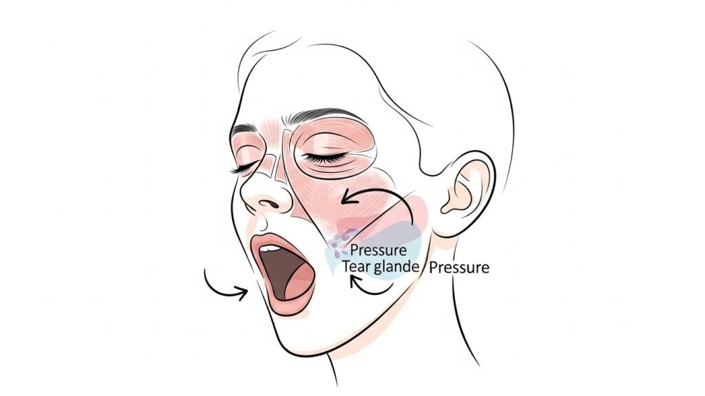 - 눈물샘 자극: 이때 턱 근처에 있는 눈물샘(누선) 주변 근육들이 함께 늘어나고 수축하면서 눈물샘을 꽉 누르게 됩니다. 마치 주머니를 쥐어짜는 것처럼요!